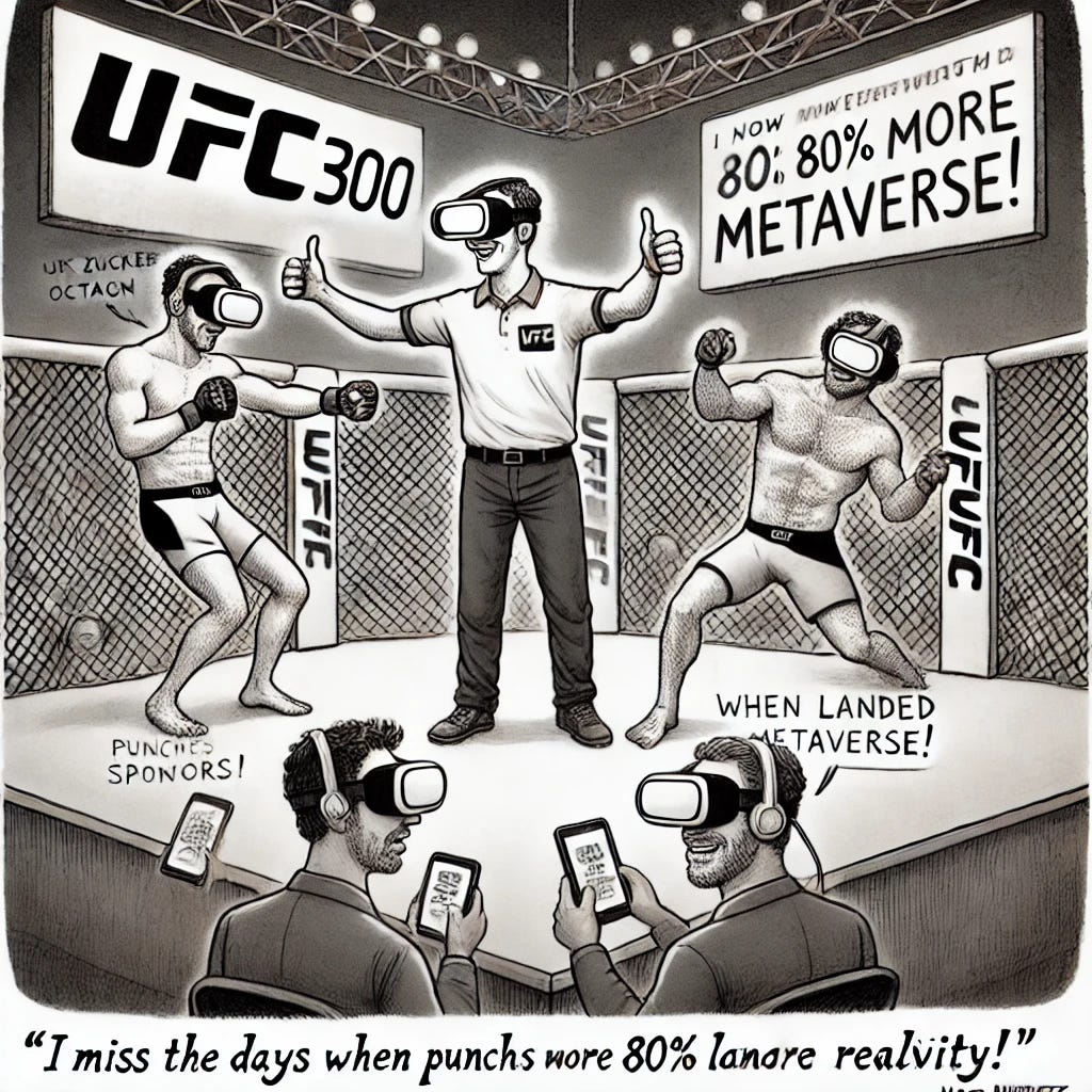 Fighters in VR headsets swing wildly in a UFC octagon. Zuck, wearing a ref shirt, gives a thumbs up next to holographic ads. A fan says, “I miss when punches landed in reality.”