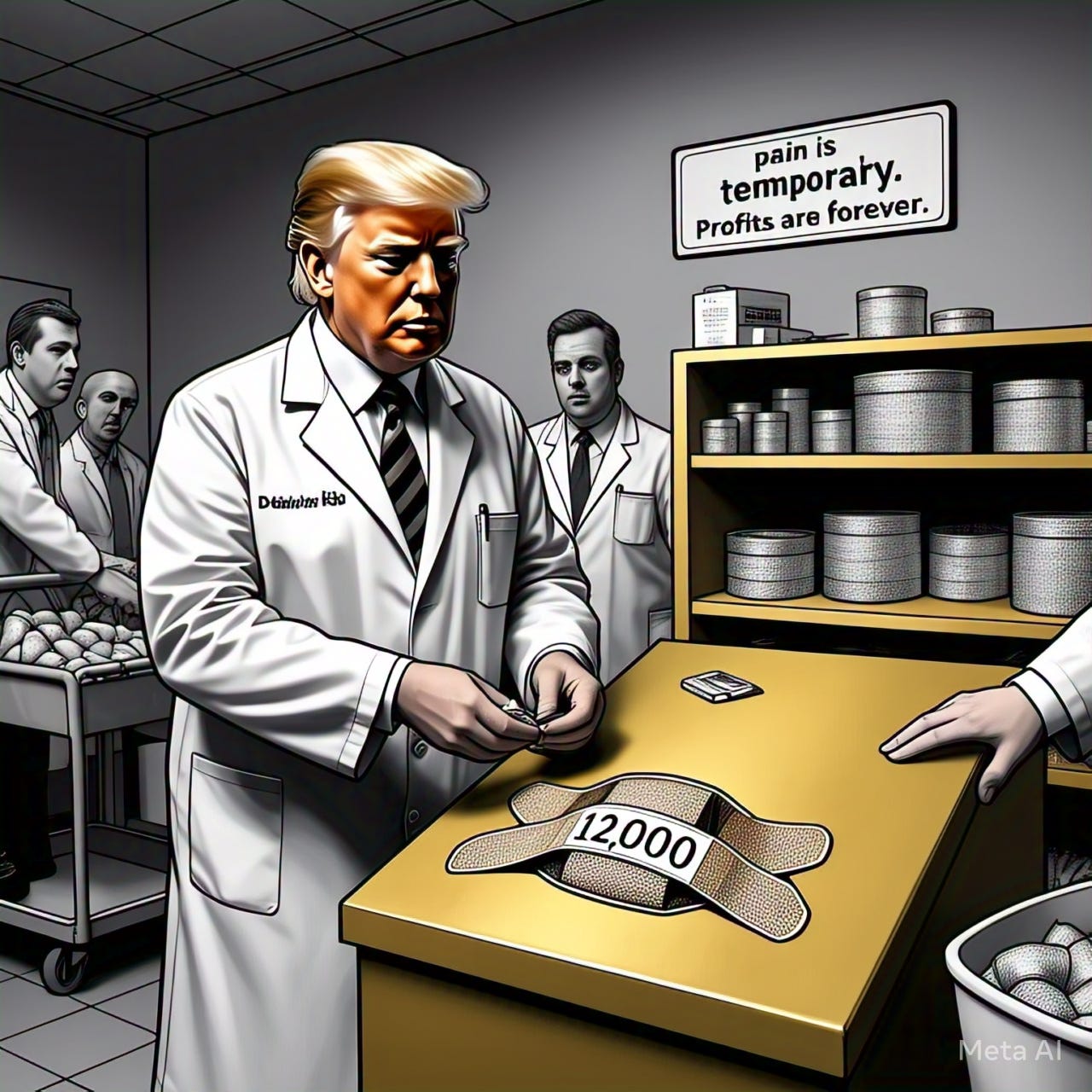 Trump, dressed like a doctor, wraps a tiny paper cut in a $12,000 jewel-studded bandage inside the “Bandage Lobby HQ.” Aides wheel in platinum gauze.
