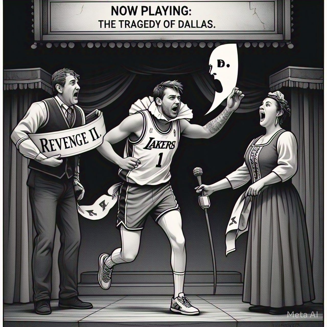 Luka in a Shakespearean collar drops 40 on his old team while dabbing a tear with one hand. A scroll on his hip reads “Revenge, Act II.” Mark Cuban weeps in the wings.