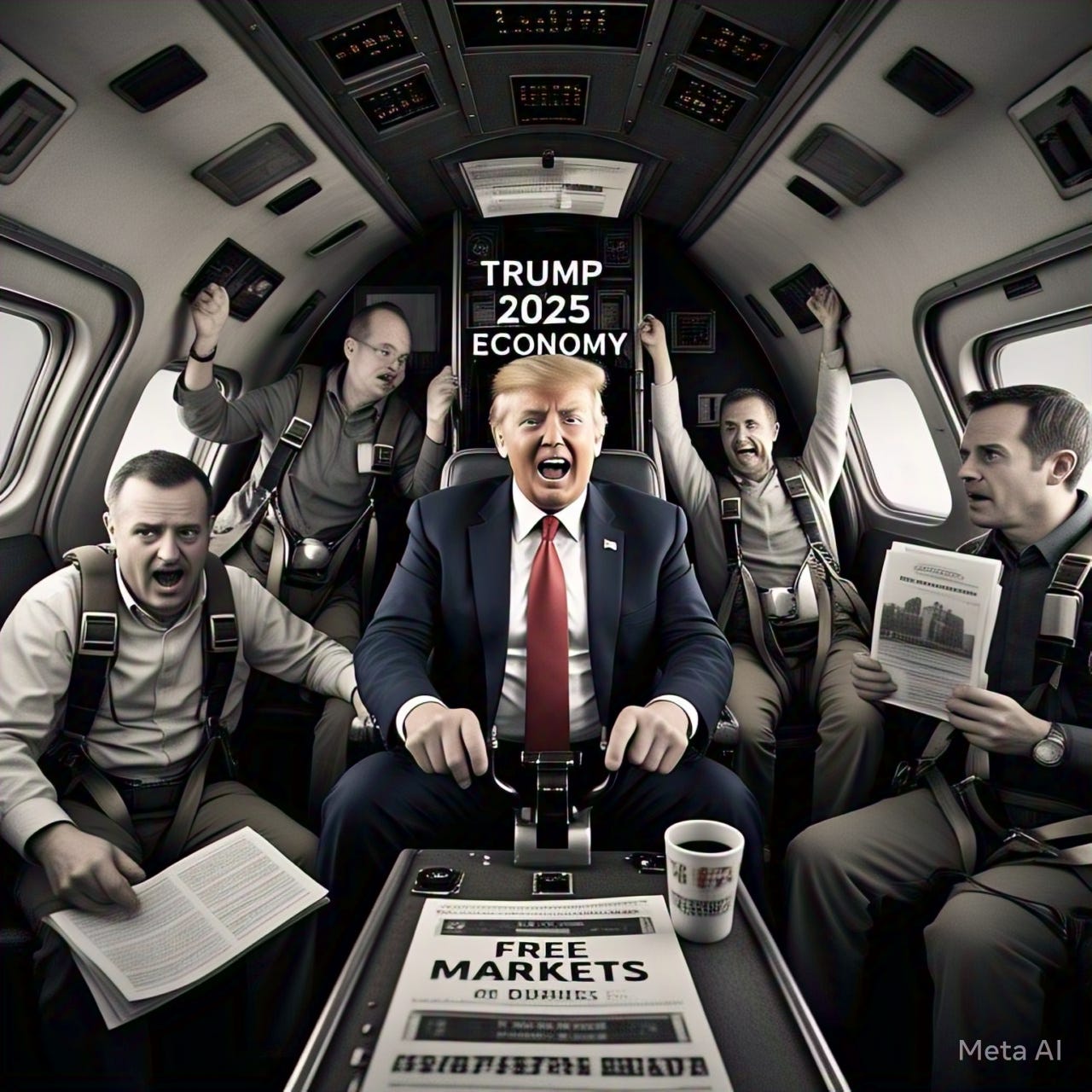A chaotic airplane labeled “Trump 2025 Economy,” with Trump at the controls slamming the “Tariff” lever. Advisors wear parachutes and read “Free Markets for Dummies.”