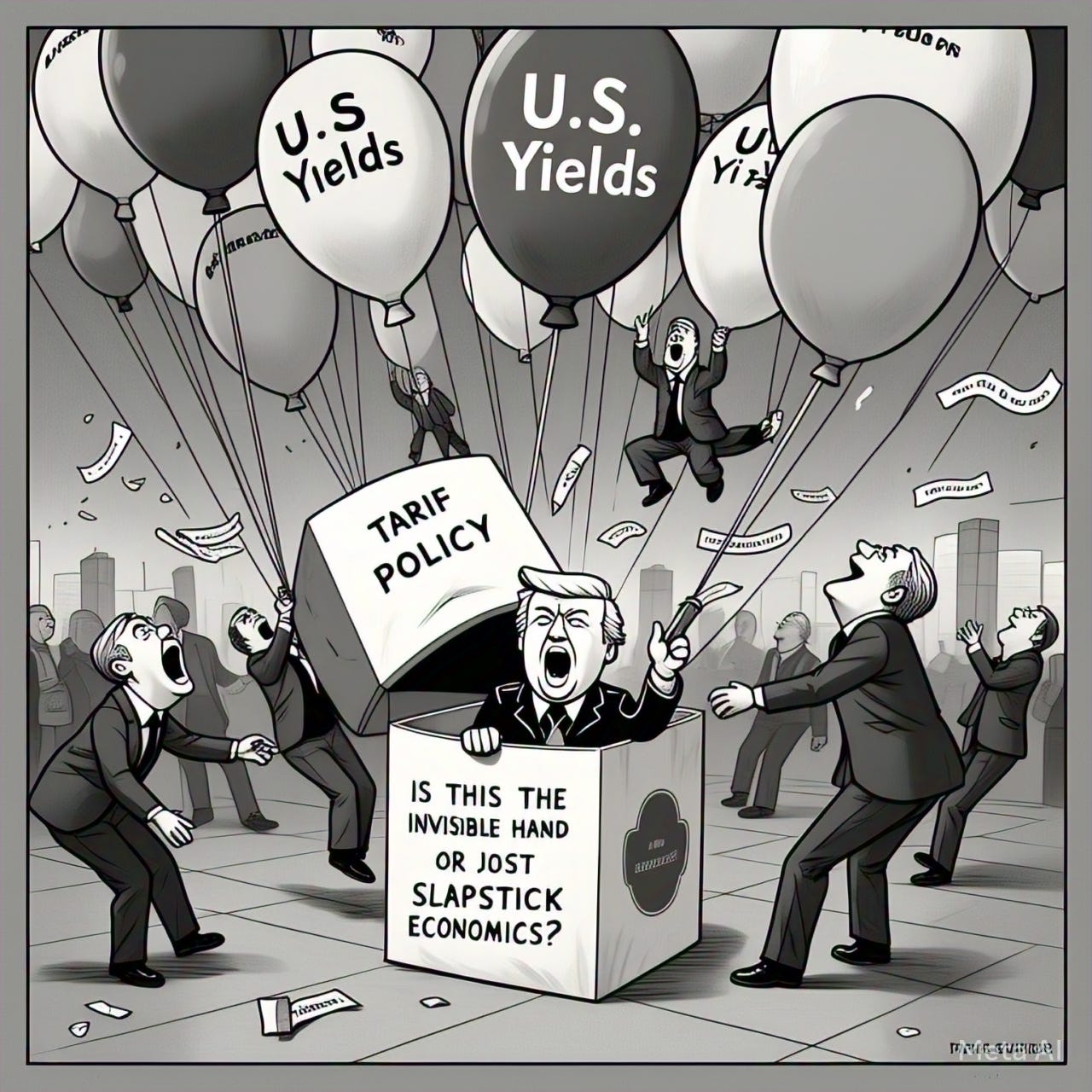 Economists climb ropes attached to ballooning “U.S. Bond Yields.” A jack-in-the-box labeled “Tariff Policy” explodes with a Trump caricature in full war regalia tossing tariff confetti.